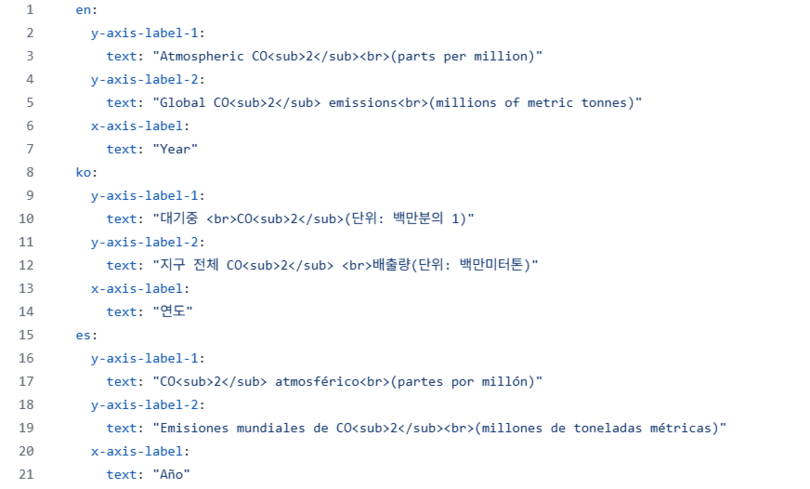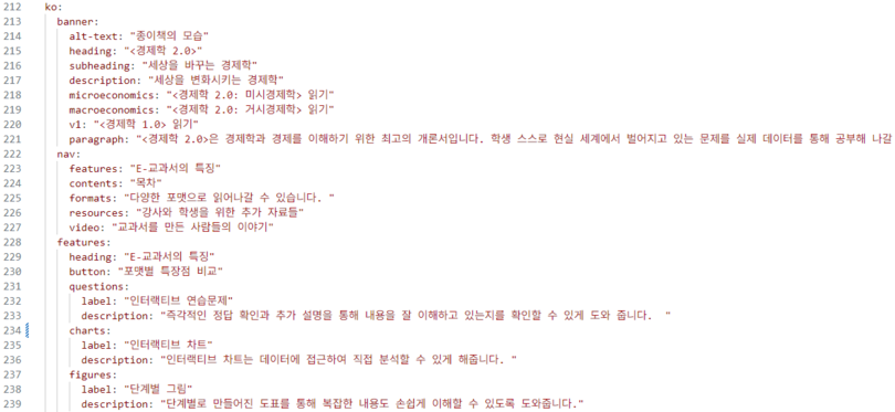In your language’s node, only translate the content between the quotation marks. To find your node, search the file for your language’s two-letter code, followed by a colon, for example, ko: finds the Korean node.