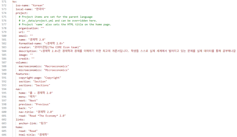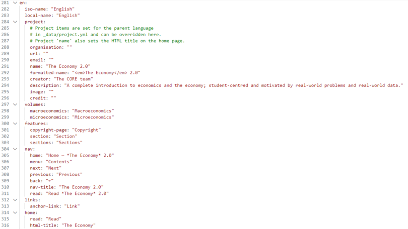 .yml, and are used to store data about and used by the book.You won’t need to learn YAML to work into these files. You just need to know that YAML relies entirely on structure, so it is essential to retain the existing structure (indentation, all punctuation) and follow the guidelines given here when adding translations to this file type.