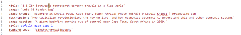 The unit, front- and endmatter markdown files include YAML frontmatter. This is everything between the set of three dashes, for example: