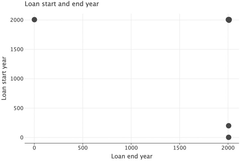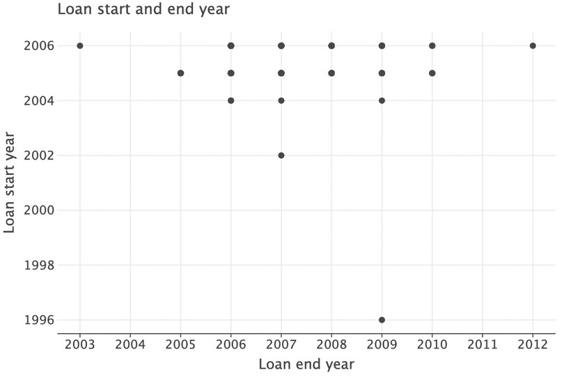 In the top-left corner, there is a loan with the start year (2006) after the end year (2003). Clearly this data entry is incorrect, so we should remove this observation when analysing loan periods. However, we will wait until we have combined the years with the months as there may be more observations with this issue.