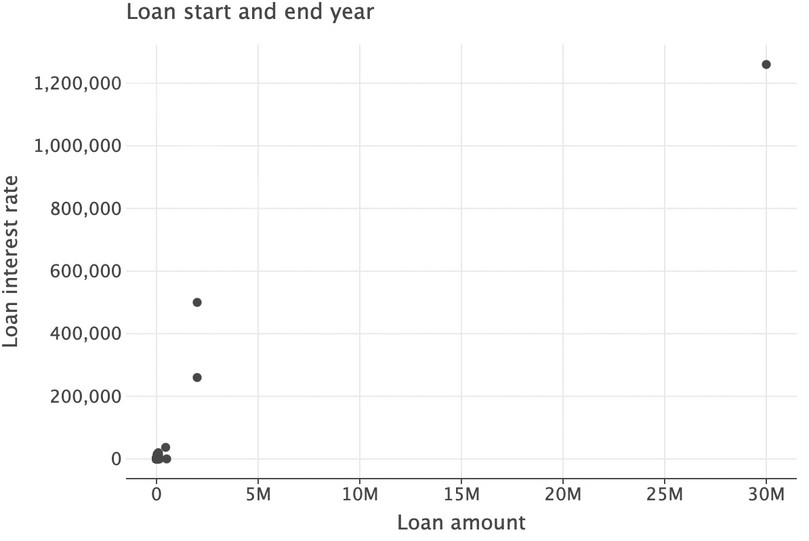( ggplot(got_l_c, aes(x="loan_amount", y="loan_interest")) + geom_point(size=3) + labs( title="Loan start and end year", x="Loan amount", y="Loan interest rate" ) + ylim(0, 3e4) + xlim(0, 2e5) )![]()