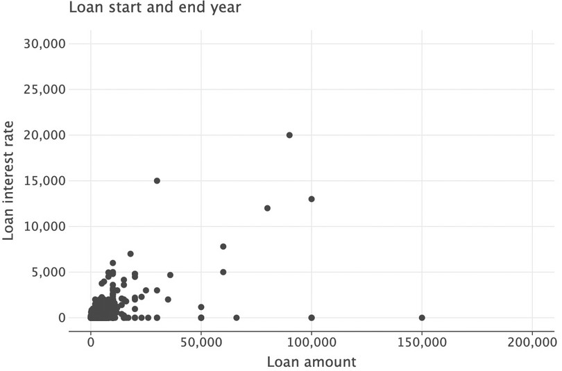 loan_interest/loan_amount.got_l_c["interest_rate"] = got_l_c["loan_interest"] / got_l_c["loan_amount"] got_l_c["interest_rate"].describe()count 1445.000000 mean 0.256616 std 5.262957 min 0.000000 25% 0.000000 50% 0.000000 75% 0.166667 max 200.000000 Name: interest_rate, dtype: float64The maximum interest rate is 200 (in other words, 20,000%), which does not make sense and could be due to a data entry error. Making another scatterplot can also identify extreme values for loan amounts: