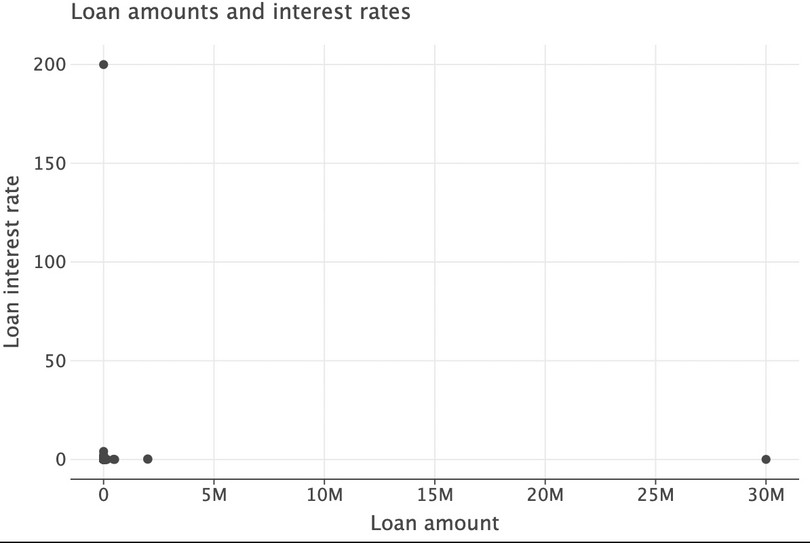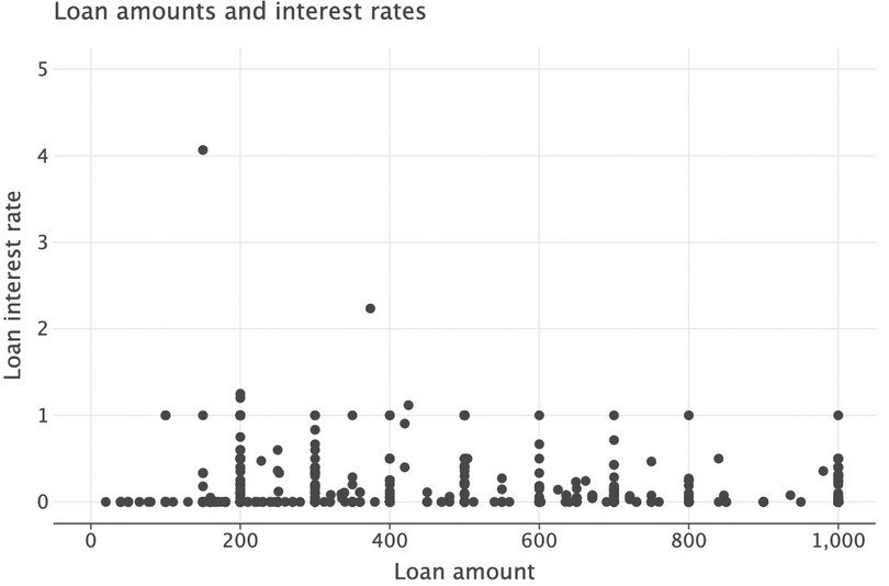 lets_plotpackage for that.( ggplot(got_l_c, aes(x="loan_amount", y="loan_interest")) + geom_point(size=3) + labs( title="Loan start and end year", x="Loan amount", y="Loan interest rate" ) )![]()