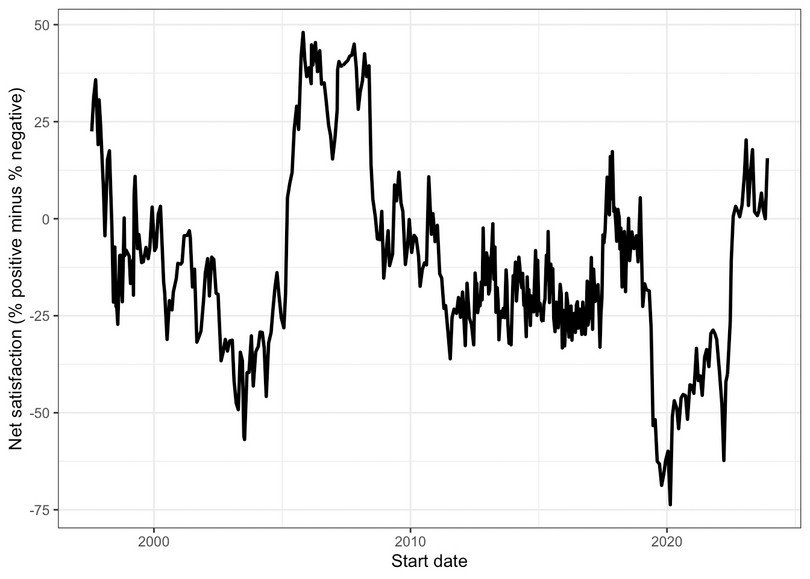 - Make a line chart with overall public satisfaction (net value, which is the difference between percentage of positive and negative responses) on the vertical axis, and time (Jan 2006 to the latest month available) on the horizontal axis. Comment on any trends in overall public satisfaction over this time period.
