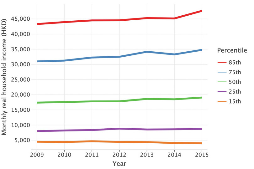 - Using the table ‘Monthly real household income (pre-tax, $HKD)’, plot a separate line chart for each percentile, with year on the horizontal axis and income on the vertical axis. Describe any patterns you see over time.