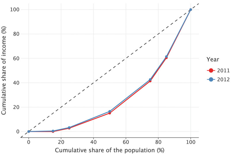 | Cumulative share of the population (%) | Perfect equality line | Cumulative share of income in 2011 (%) | Cumulative share of income in 2012 (%) |