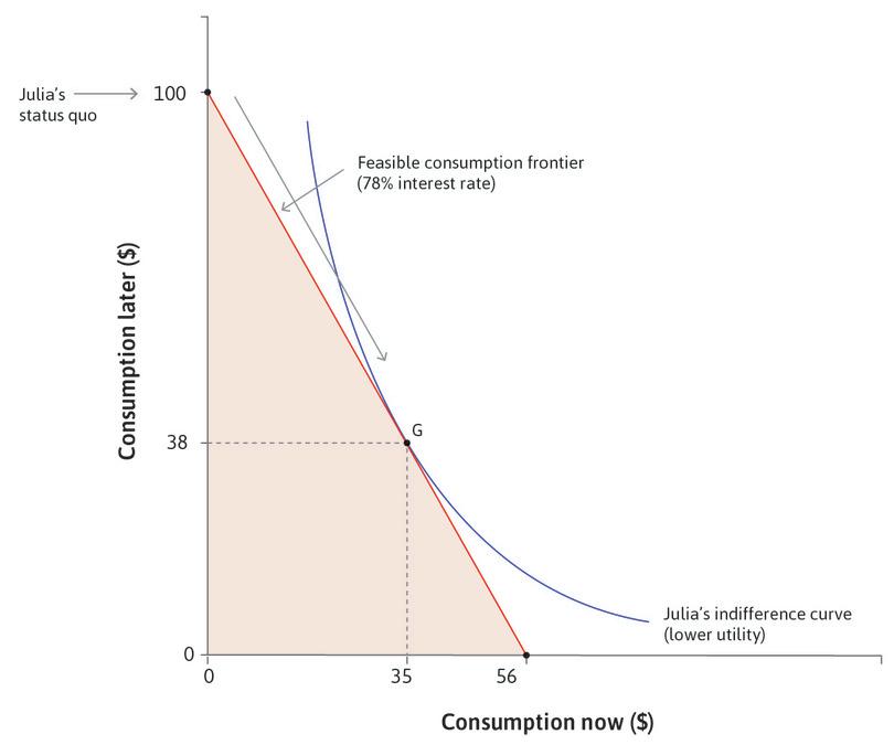 Initially Julia is at the point labelled ‘Julia’s endowment’ in Figure 10.3. To consume now, Julia is considering taking out a payday loan (or she could be a farmer borrowing to finance her consumption before she can harvest and sell her crop).