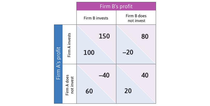 From this figure you can see what happens when the virtuous (both invest) and vicious (neither invest) circles occur. Note what happens if one of the firms invests but the other does not. If Firm A invests and B does not (the upper-right cell in the figure) then A pays to install new equipment and premises, but because the other firm did not invest there is no demand for the products that the new capacity could produce; so A makes a loss. But had B known that A would invest, then B would have made higher profits by investing as well (getting 100 rather than only 80). On the other hand, had B known that A was not going to invest, then it would have done better to also not invest.