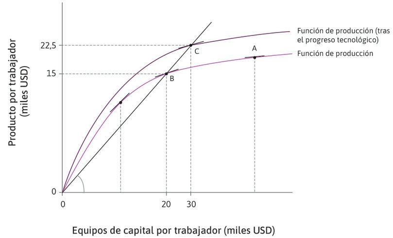- En el diagrama, C y B tienen el mismo producto medio del capital. Sin embargo, estos dos puntos no están al mismo nivel de capital por trabajador. A un nivel dado de capital por trabajador, tanto el producto medio como la productividad marginal del capital aumentan con el progreso tecnológico.