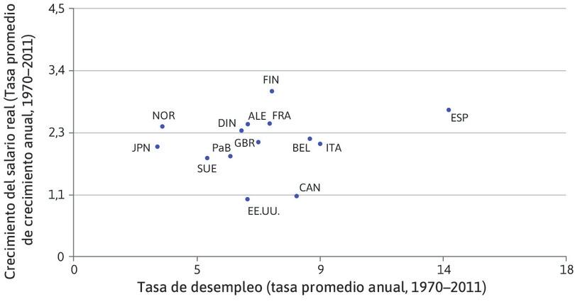 Las tasas de desempleo fueron bajas y bastante similares en la década de 1960. Luego divergieron en la década de 1970, reflejando en parte las diferentes respuestas a las crisis del petróleo descritas en el capítulo 14. De estos países, solo Japón (JPN), Austria (AUT) y Noruega (NOR) registraron tasas de desempleo que permanecieron por debajo del 6% durante todo el periodo. En España (ESP), el desempleo fue de alrededor del 20% desde mediados de la década de 1980 hasta finales de la de 1990. Luego se redujo a la mitad en la década de 2000, antes de escalar de nuevo a más del 20% tras la crisis financiera y la crisis de la eurozona de 2009. En este sentido, el caso de Alemania (DEU) es poco habitual: el desempleo cayó en los años posteriores a la crisis financiera mundial.