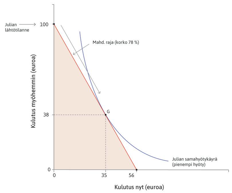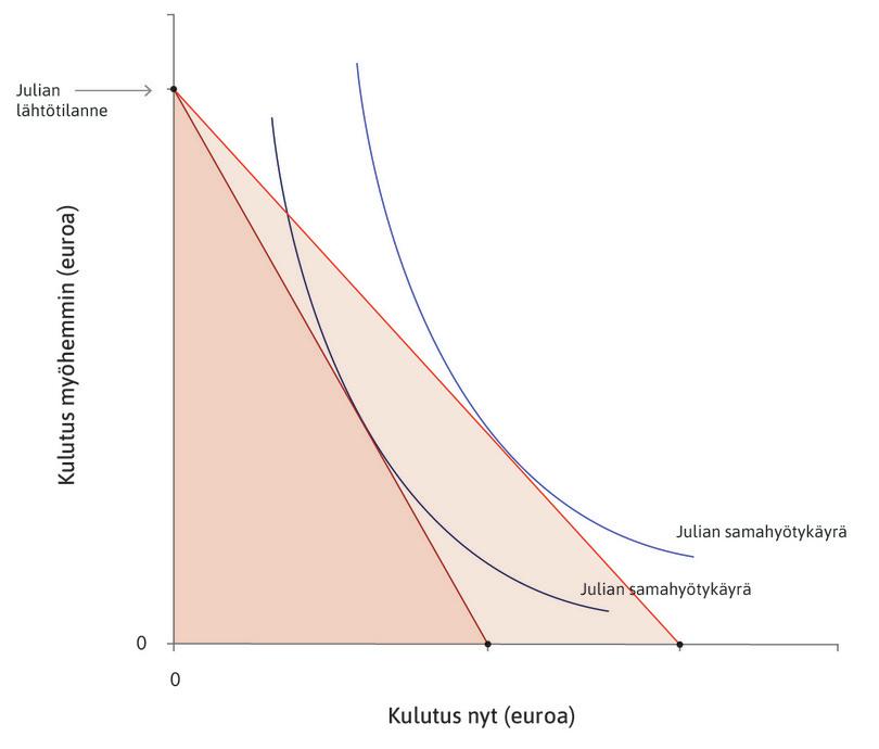 Ottamalla ja antamalla lainaa voimme säädellä mahdollisuuksiamme ostaa tavaroita ja palveluita eri aikoina. Jos otamme lainaa, pystymme ostamaan nyt enemmän mutta tulevaisuudessa vähemmän. Ajatellaanpa Juliaa, jolla on nyt kulutustarpeita muttei rahaa. Hän tietää saavansa myöhemmin sata euroa palkkana tai sadon myyntituottona. Julian tilannetta kuvaa kuvio 10.2. Kuvion pisteet edustavat Julian kulutusmahdollisuuksia nyt ja myöhemmin. Oletamme, että hän kuluttaa kaiken, mitä hänellä on. Jokainen kuvion piste kuvaa hänen tämän hetken kulutuksensa ja myöhemmän kulutuksensa yhdistelmää.