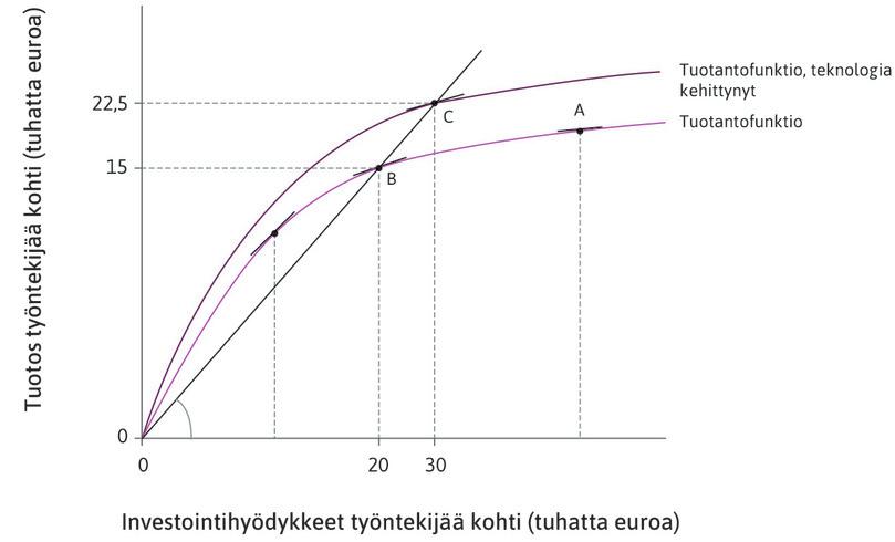 Kuvioon 16.2 on piirretty sinisellä katkoviivalla suora, joka lähtee origosta ja leikkaa sekä vanhan että uuden teknologian mukaiset tuotantofunktiot. Suoran kulmakerroin kertoo tuotoksen määrän yhtä investointihyödykkeiden yksikköä kohti pisteessä, jossa suora leikkaa tuotantofunktion. Tämä luku on tuotos työntekijää kohti jaettuna investointihyödykkeillä työntekijää kohti. Kaaviosta näemme, että tuotantofunktioiden pisteissä B ja C tuotos yhtä investointihyödykkeiden yksikköä kohti on sama.
