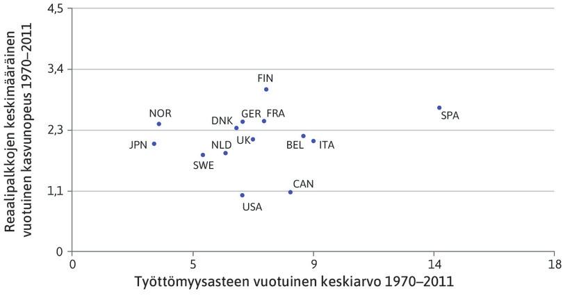 Työttömyysasteet olivat 1960-luvulla kaikissa maissa suurin piirtein yhtä matalat. 1970-luvulla ne alkoivat eriytyä osittain siksi, että maat toimivat öljykriiseissä eri tavoin (katso luku 14). Kuvion maista vain Japanin (JPN), Australian (AUS) ja Norjan (NOR) työttömyysasteet pysyivät öljykriisien aikana alle kuudessa prosentissa. Espanjassa (SPA) työttömyysaste jäi 20 prosentin tuntumaan 1980-luvun puolivälistä 1990-luvun loppuun. Se ehti 2000-luvulla puolittua, kunnes finanssikriisi ja eurokriisi nostivat sen vuonna 2009 uudelleen yli 20 prosenttiin. Saksa (GER) erottuu muista, sillä sen työttömyysaste laski finanssikriisin jälkeisinä vuosina.