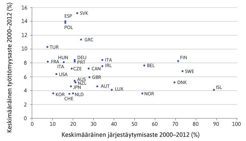 Vuosien 1960–2004 aineisto: David R Howell, Dean Baker, Andrew Glyn ja John Schmitt. 2007. ”Are Protective Labor Market Institutions at the Root of Unemployment? A Critical Review of the Evidence”. Capitalism and Society 2 (1) (tammikuu). Vuosien 2005–2012 aineisto: OECD. 2015. OECD:n tilastotietokanta.