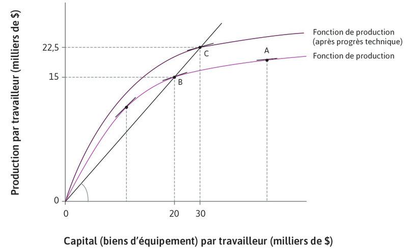 - Sur le graphique, les points A et B ont la même productivité moyenne du capital. En revanche, le niveau de capital par travailleur y diffère. Pour un niveau donné de capital par travailleur, les productivités moyenne et marginale du capital augmentent toutes deux avec le progrès technologique.