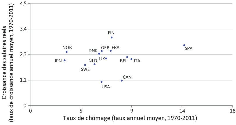 La Figure 16.21 reprend la Figure 16.20 en indiquant les institutions et les politiques publiques qui peuvent avoir une incidence sur la croissance des salaires réels et le taux de chômage.