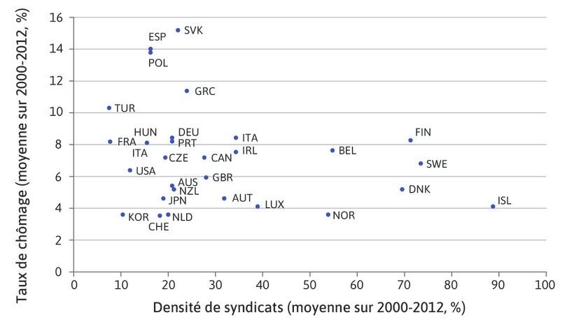 Données de 1960 à 2004 : David R Howell, Dean Baker, Andrew Glyn, and John Schmitt. 2007. ‘Are Protective Labor Market Institutions at the Root of Unemployment? A Critical Review of the Evidence’. Capitalism and Society 2 (1) (January). Données de 2005 à 2014 : OECD. 2015. OECD Statistics.