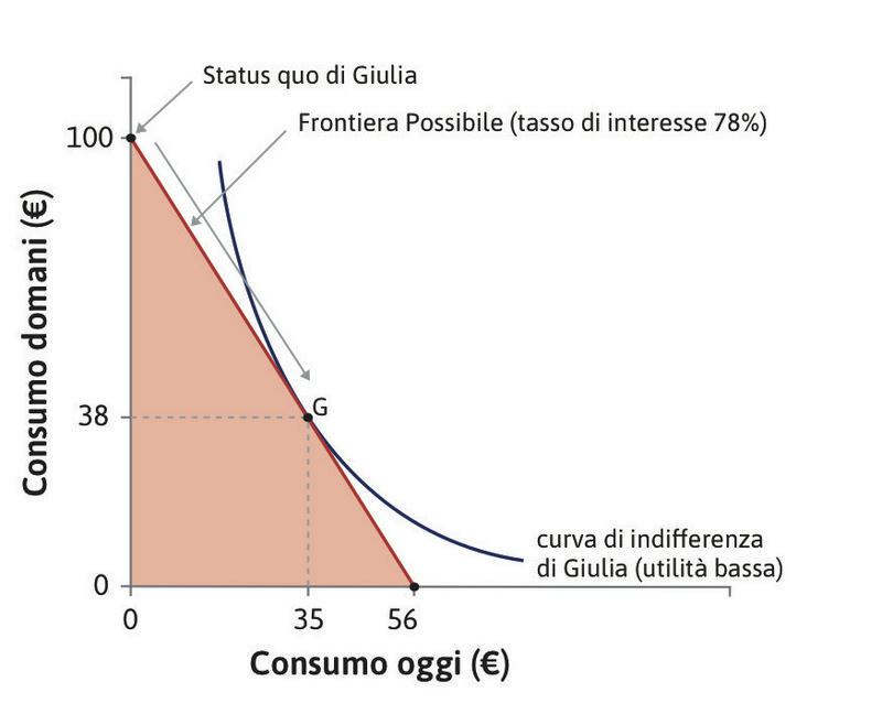 La sua situazione iniziale è raffigurata dal punto “dotazione di Giulia”. Per consumare oggi, Giulia può contrarre un debito a breve termine; può ad esempio prendere 91 € in prestito rimborsando 100 € nel periodo successivo. Tale valore (montante) include il capitale preso a prestito e gli interessi, calcolati al tasso r: