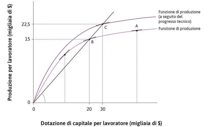 Nella figura 16.2 notiamo una retta tratteggiata di colore blu che passa per l’origine degli assi e interseca la vecchia e la nuova funzione di produzione. La pendenza di questa retta misura la produttività media del capitale in corrispondenza del punto in cui la retta interseca ciascuna funzione di produzione; la produttività media è misurata infatti come il rapporto tra l’output e il capitale per addetto. Guardando il grafico, possiamo dunque concludere che i punti B e C delle due funzioni di produzione sono caratterizzati dalla stessa prodottività media del capitale.