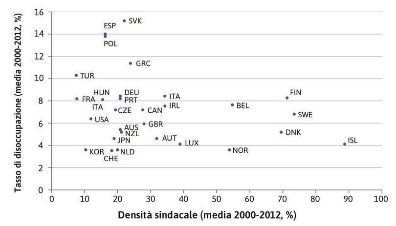 - In Norvegia, Danimarca, Svezia e Finlandia la correlazione tra tasso di disoccupazione e tasso di densità sindacale è positiva. Il tasso di disoccupazione è dunque elevato pur a fronte di alti tassi di densità sindacale.